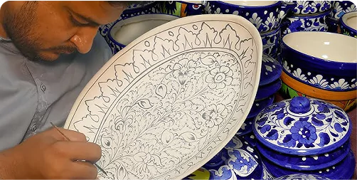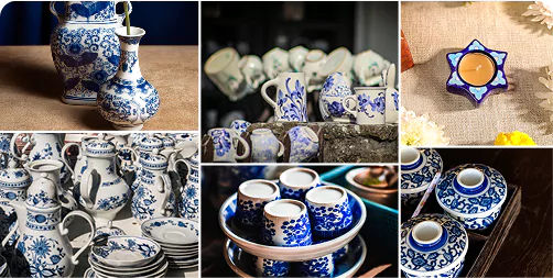 Blue Pottery is known for creating decorative and utilitarian items, including vases, plates, tiles, bowls, jars, and ornamental pieces. The designs often feature floral, geometric, and animal motifs inspired by Persian and Indian aesthetics.