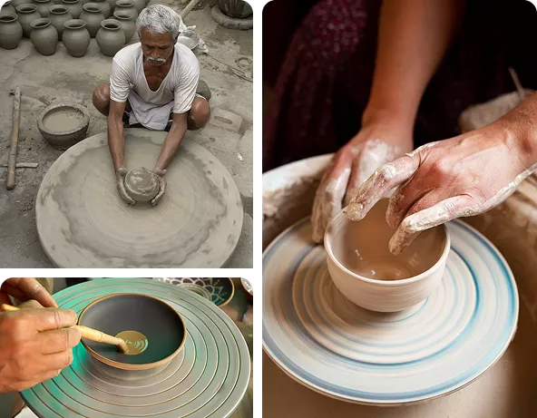 Shaping the Vessel : Artisans form pots, lamps, or figurines with balanced curves.