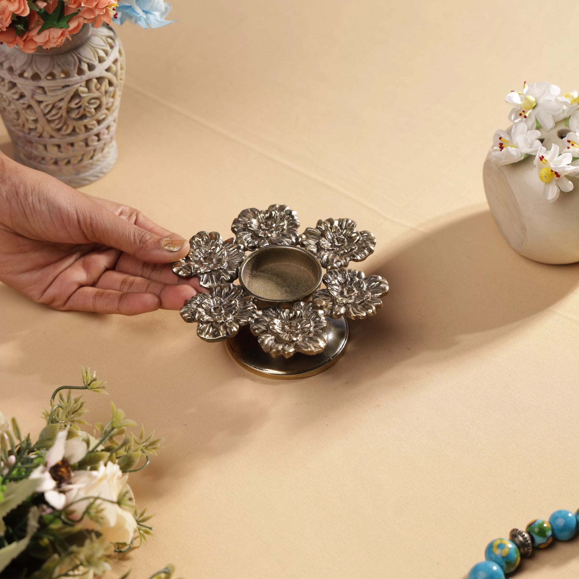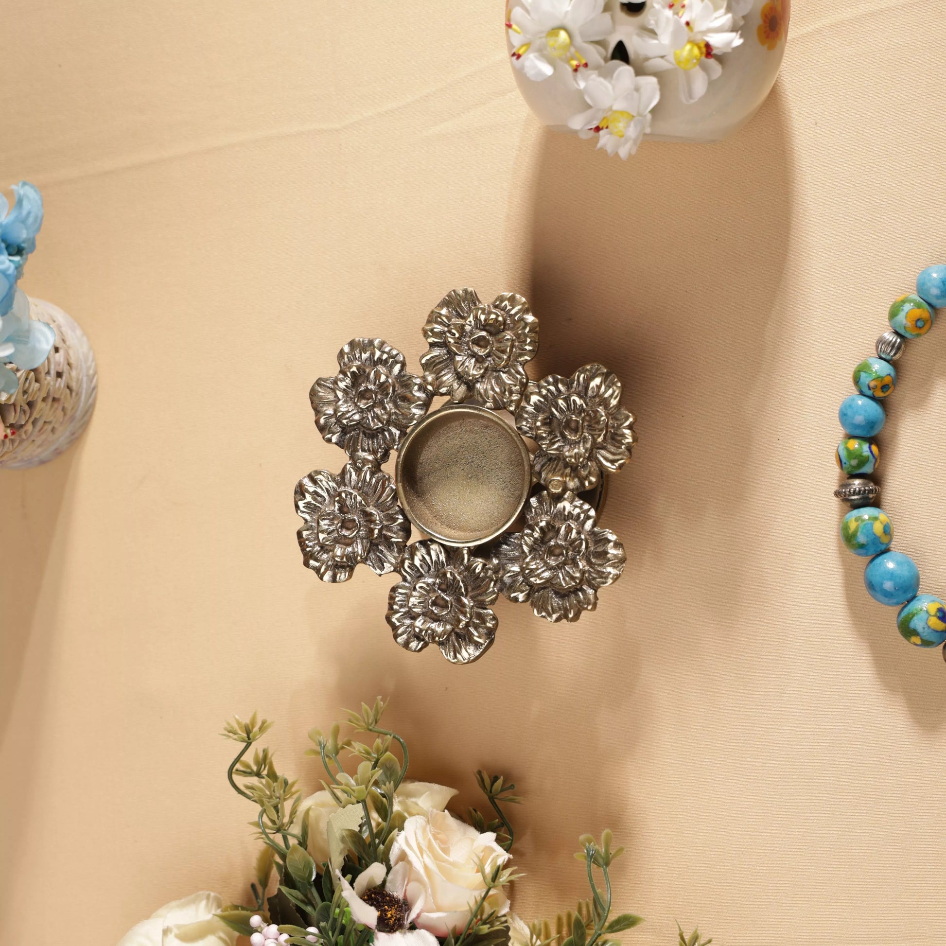 Antique Finish Brass Chrysanthemum Flowers T-Light Candle Holder