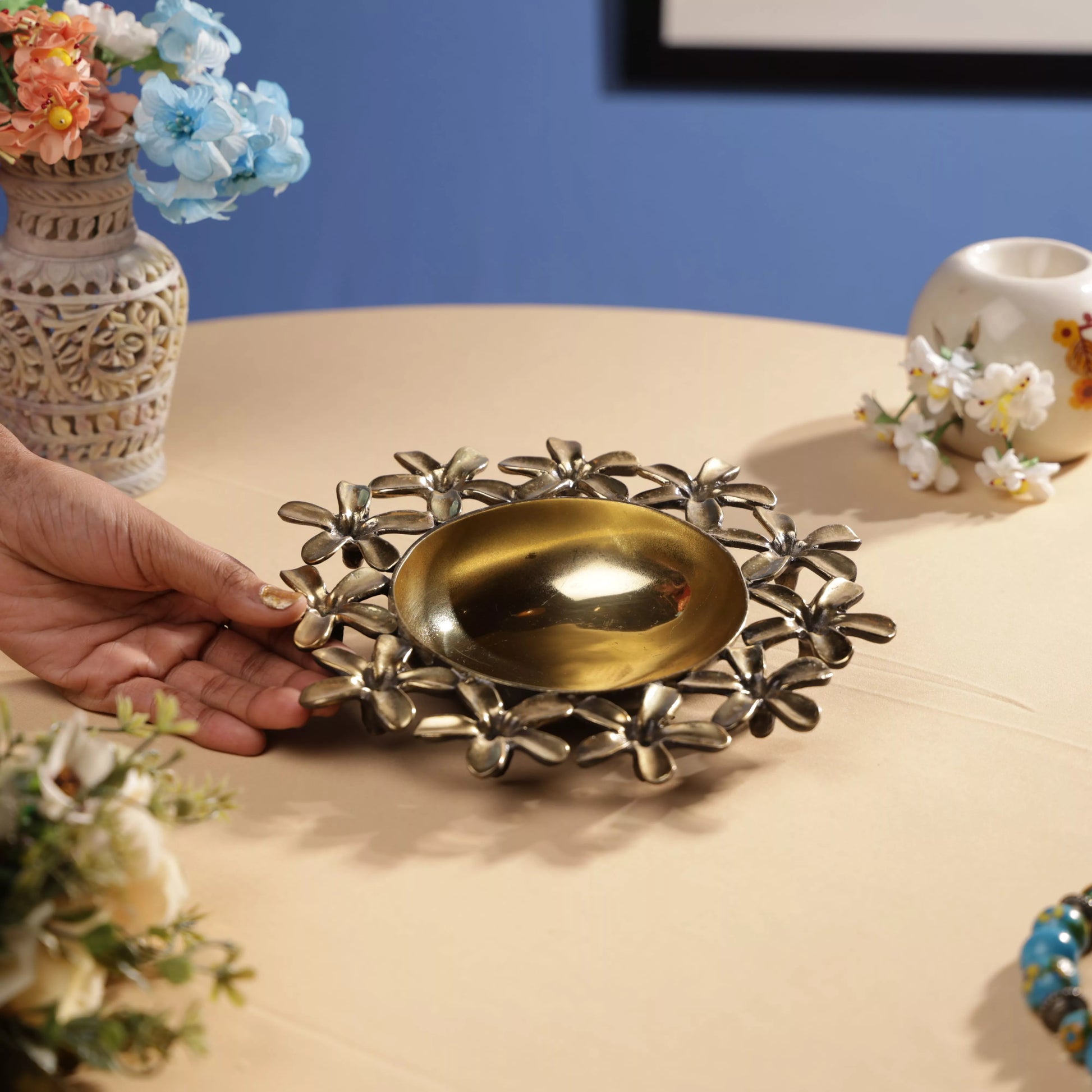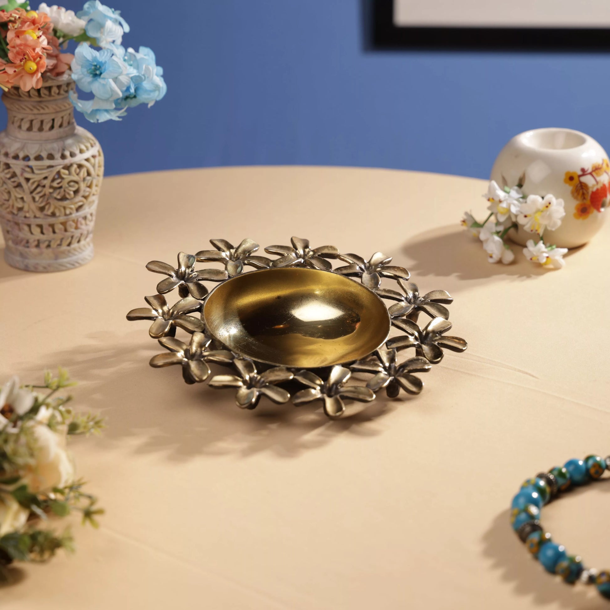 Antique Finish Brass Pulmeria Flower Taper Urli