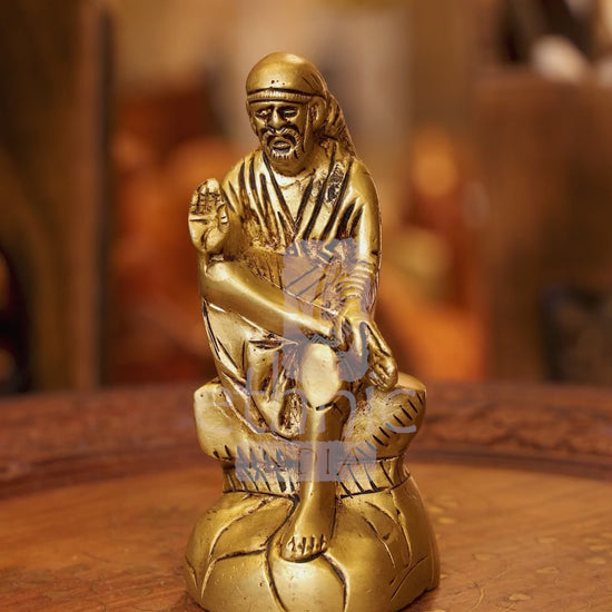Brass idol of Sai Baba seated peacefully on a pedestal, symbolising faith, guidance, and spiritual strength for every devotee.