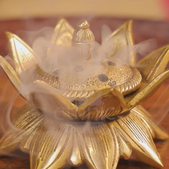 This lotus-shaped brass incense holder features intricate petal detailing, making it perfect for spiritual practices, meditation corners, or decorative pooja setups.