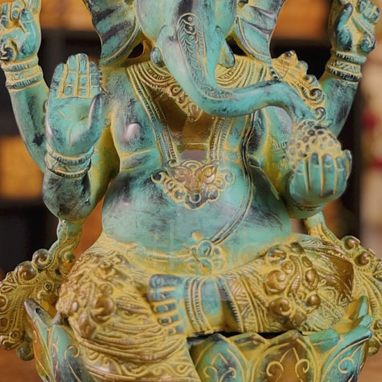 This coloured brass idol of Lord Ganesha in antique finish symbolises wisdom, prosperity, and protection—perfect for pooja spaces and festive decor.