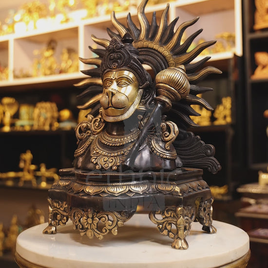 Featuring Lord Hanuman in a bold bust form adorned with coloured stone accents, this intricately detailed brass idol reflects his unwavering loyalty and divine might—perfect for pooja spaces or as a powerful spiritual centrepiece.