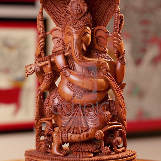 11" Kadam Wood Carved Lord Gnesha Fluting under Seesh Naag